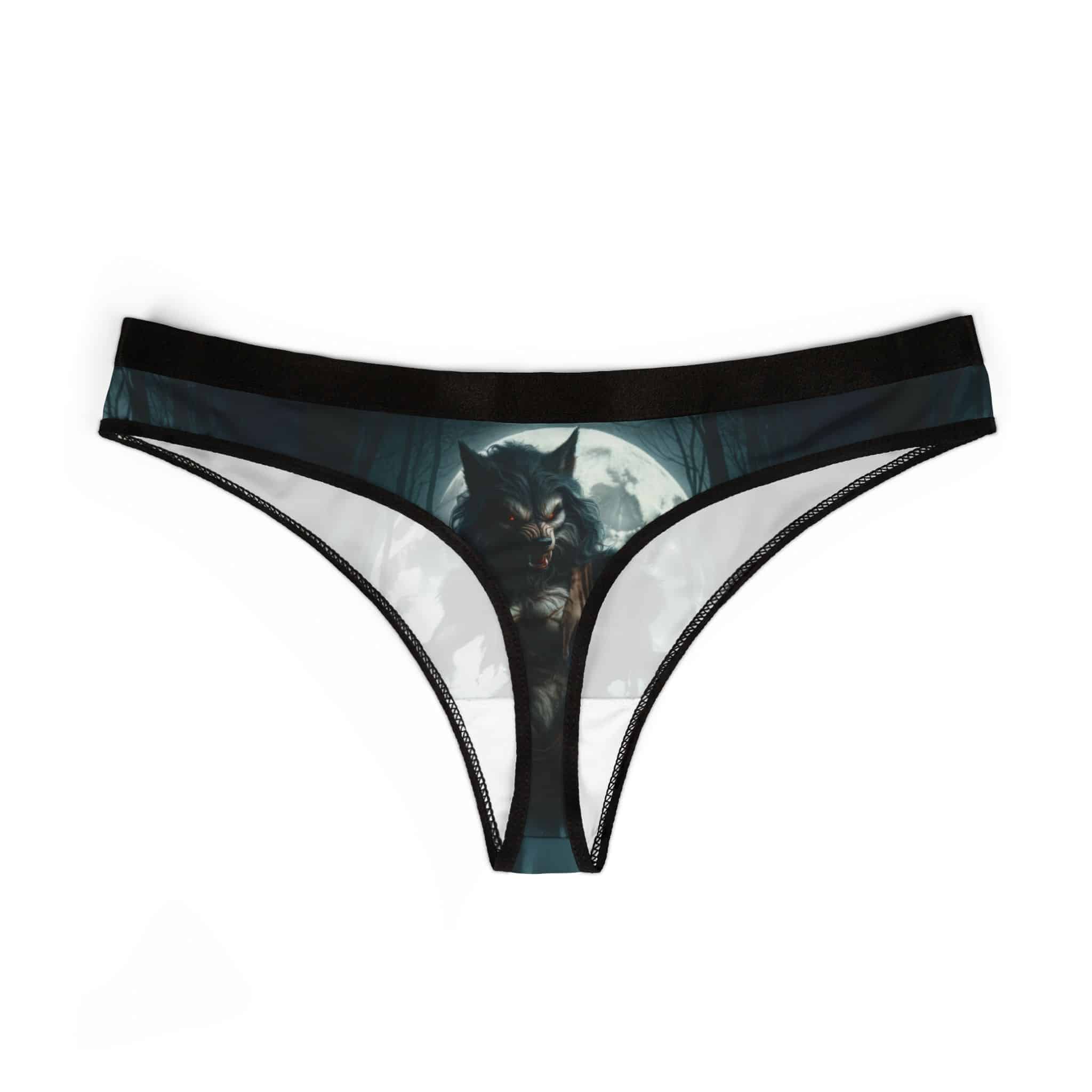 This She-Werewolf Full Moon Thongs feature a sinister dark design, perfect for those who love a touch of the supernatural in their wardrobe. With its comfortable elastic waistband and breathable antimicrobial fabric, these thongs provide both style and comfort. Ideal for women who enjoy unique and edgy fashion, this product is perfect for Halloween, costume parties, or fans of werewolves.
