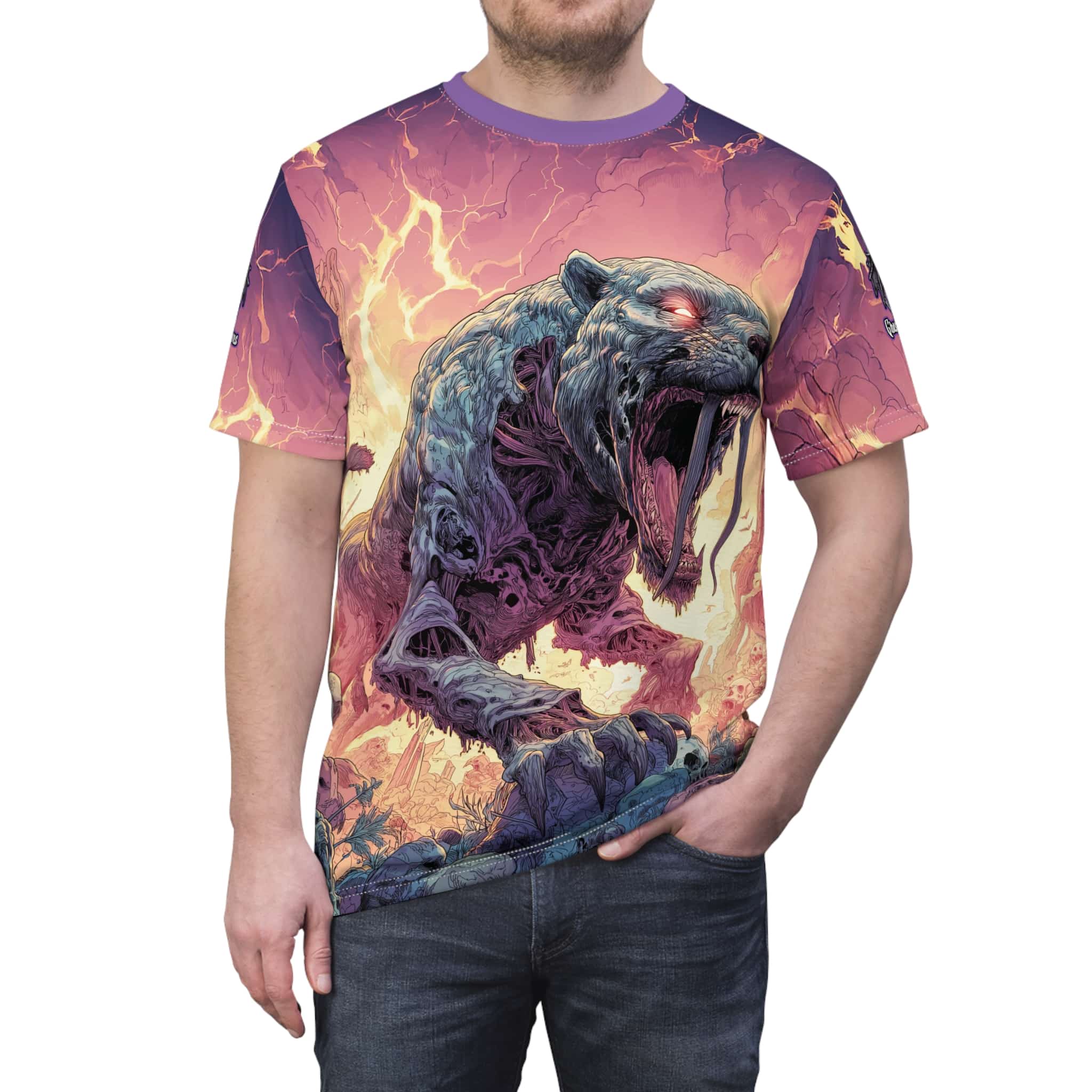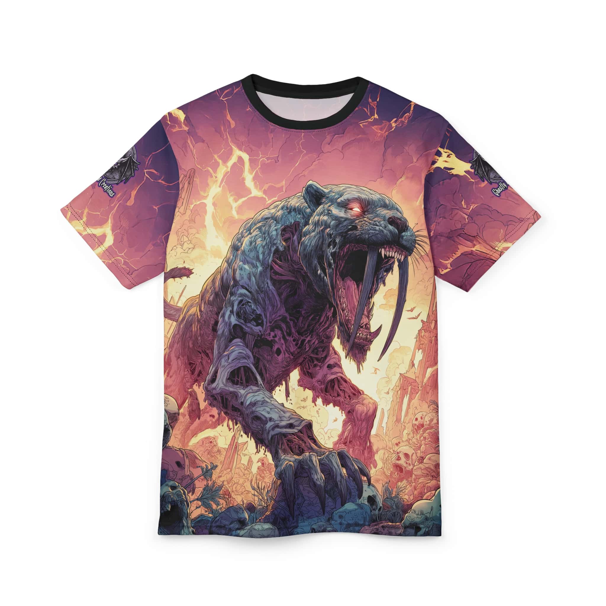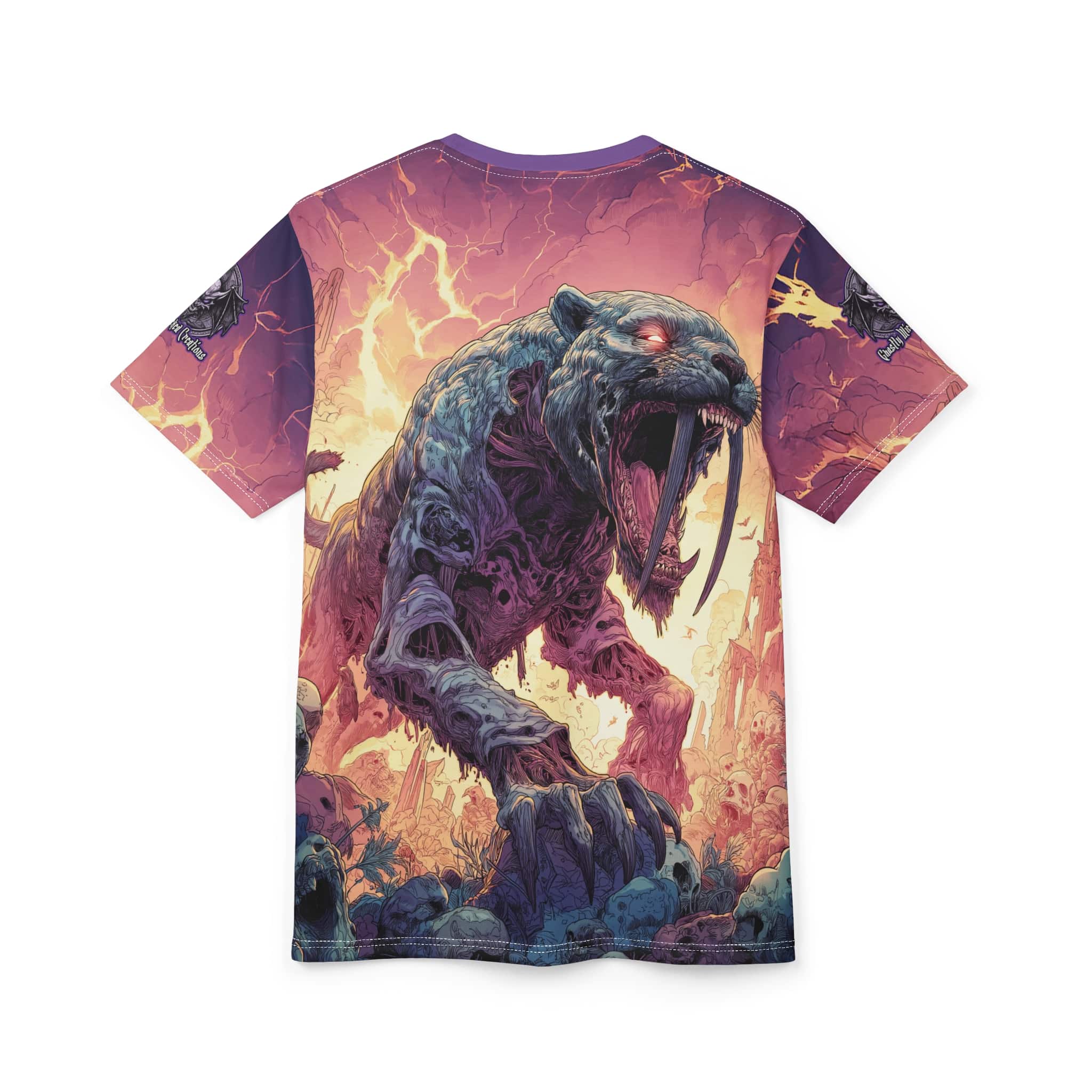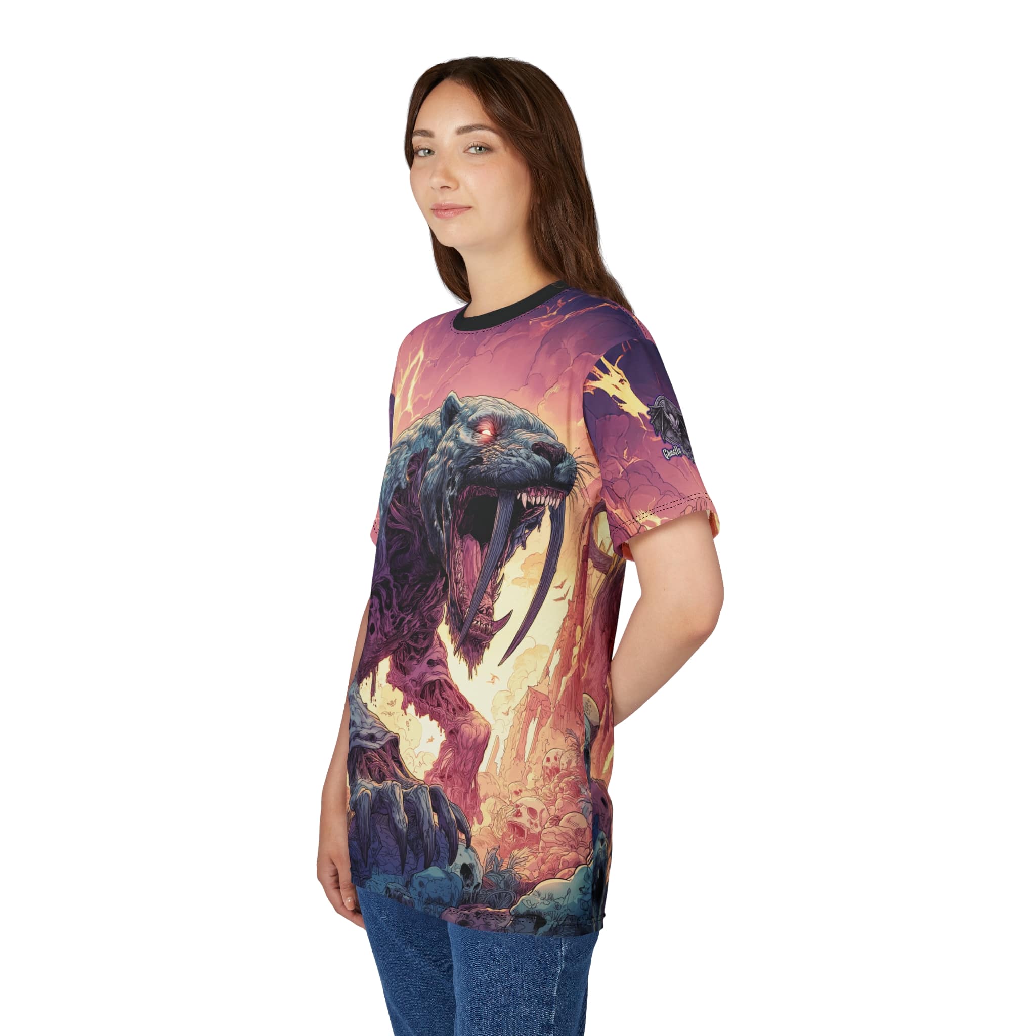 This Zombie Smilodon Sabretooth Cat In Volcanic Wasteland Tee is a fun and unique addition to any wardrobe. Perfect for dinosaur and zombie enthusiasts, this tee gives off a cool and quirky vibe. It’s great for casual wear and can be a conversation starter. Ideal for Halloween, themed parties, and everyday wear.