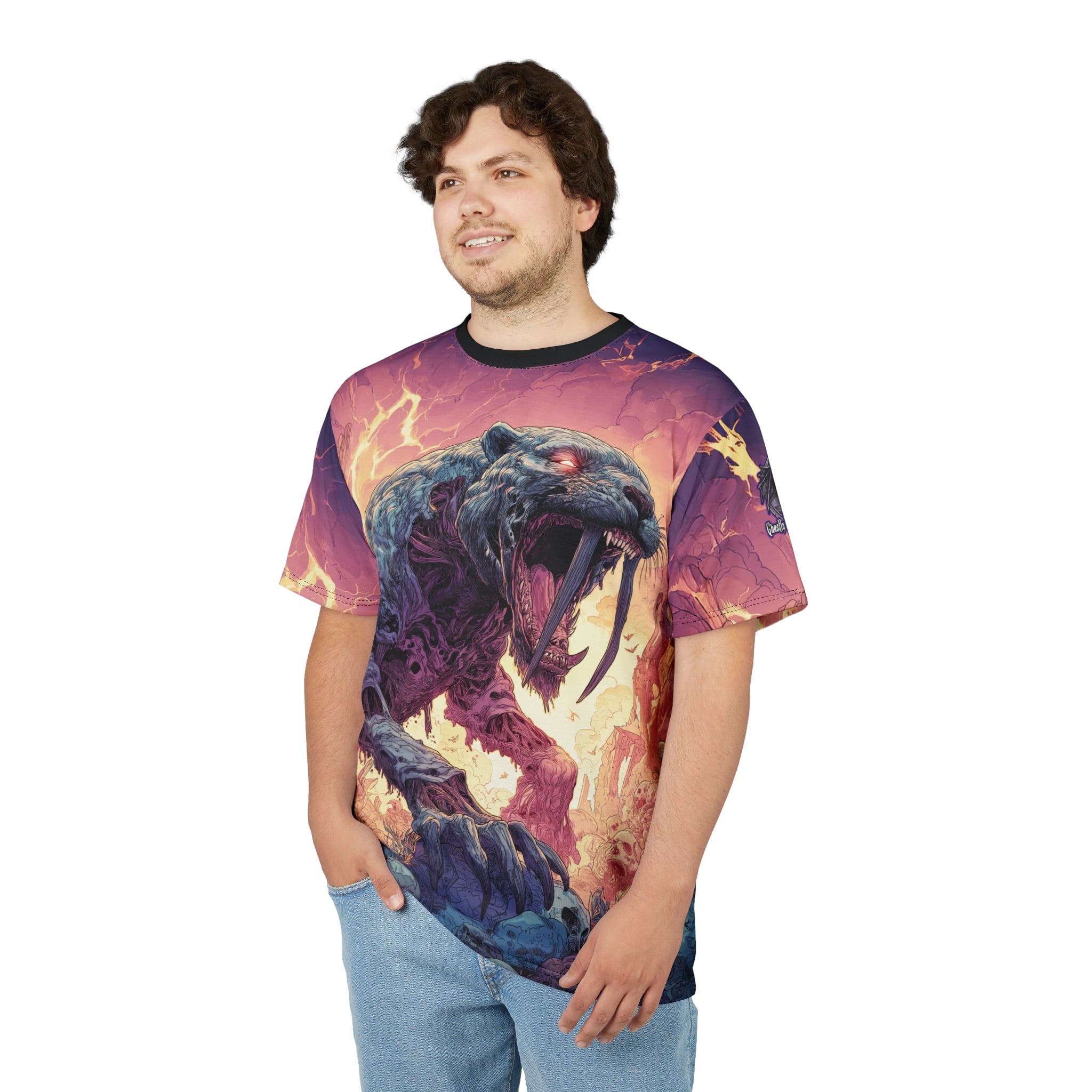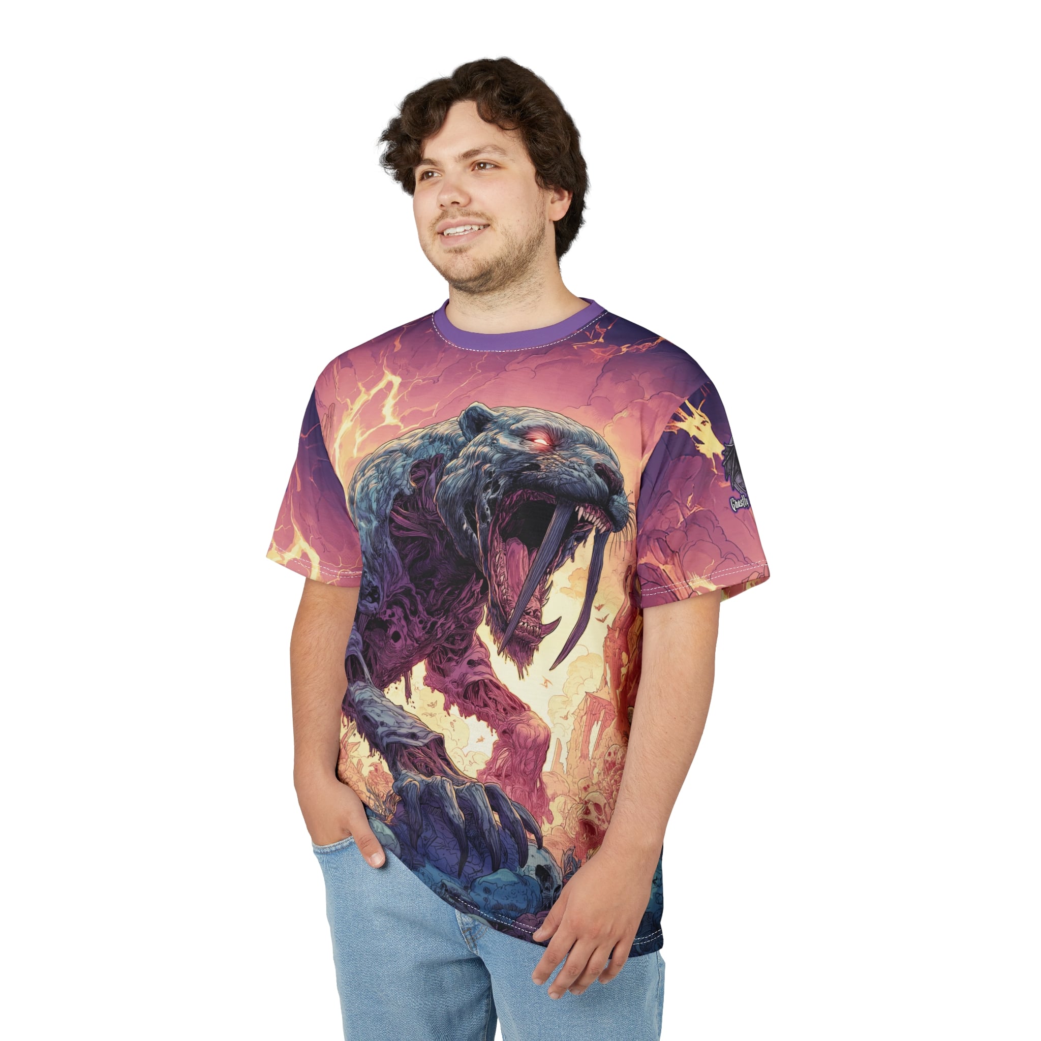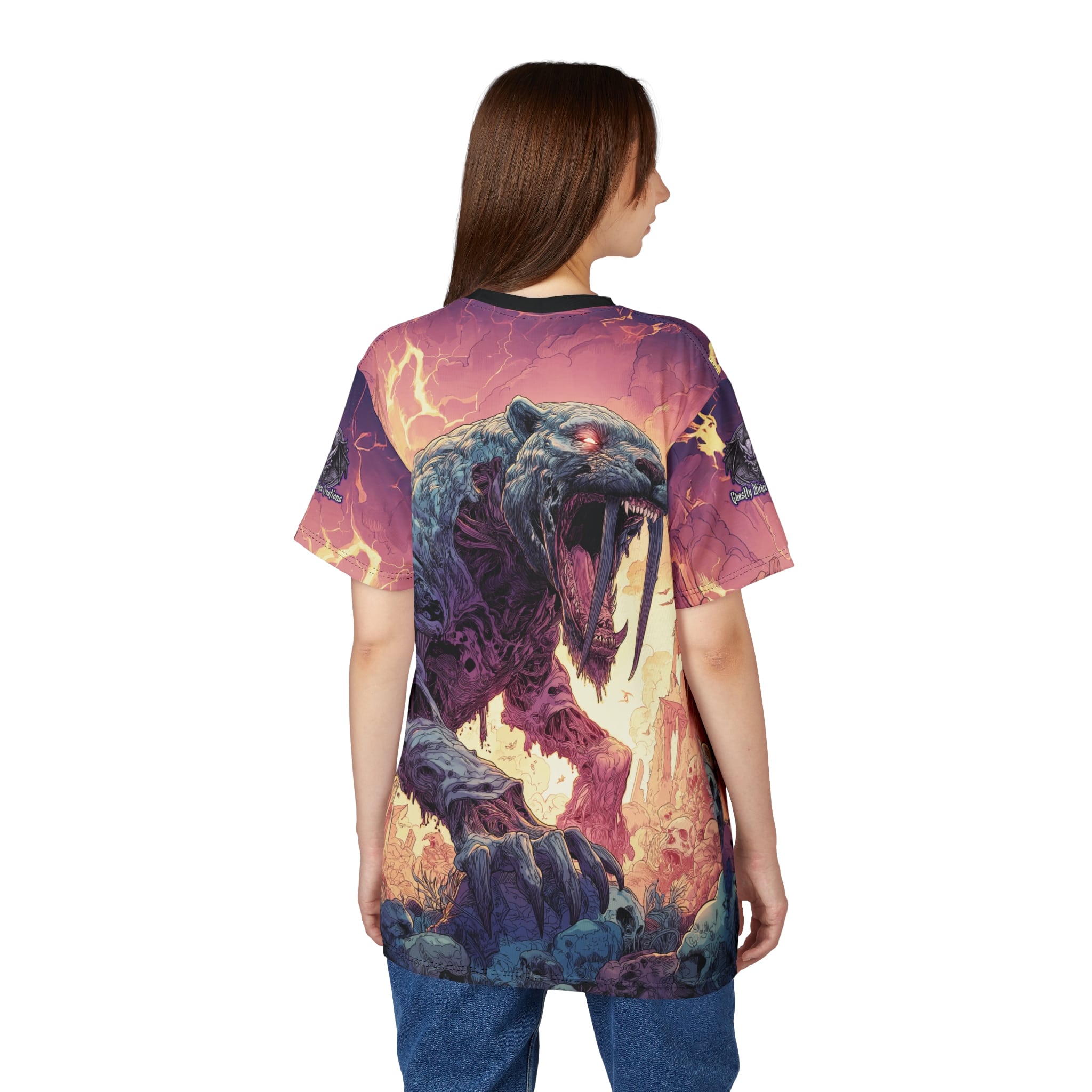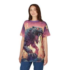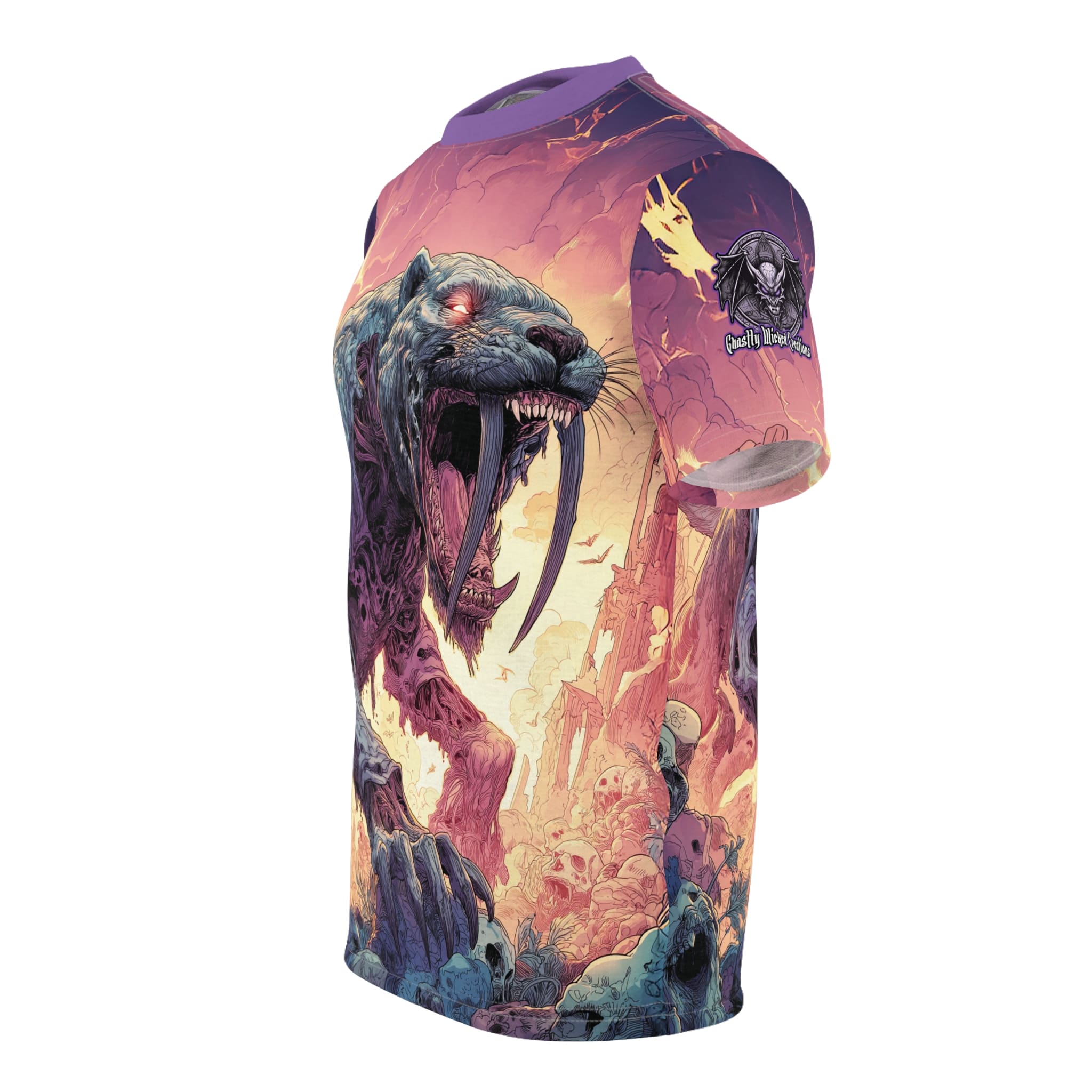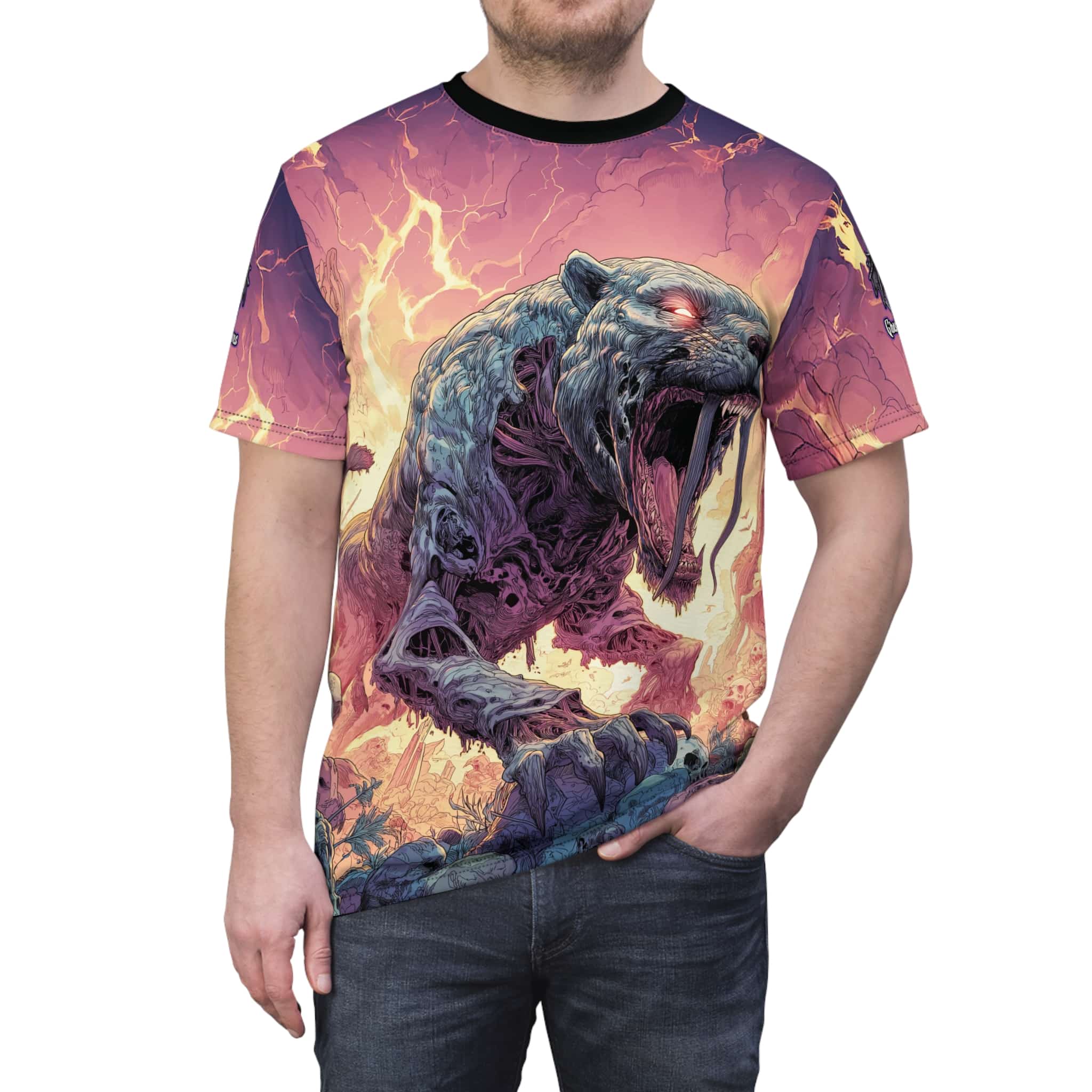 This Zombie Smilodon Sabretooth Cat In Volcanic Wasteland Tee is a fun and unique addition to any wardrobe. Perfect for dinosaur and zombie enthusiasts, this tee gives off a cool and quirky vibe. It’s great for casual wear and can be a conversation starter. Ideal for Halloween, themed parties, and everyday wear.